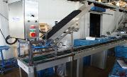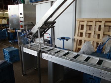 Der Schalenspender kann auf einem eigenen Untergestell geliefert werden oder direkt auf dem Einlaufband montiert werden, wobei ein Freiraum von 40 mm je Seite vom Einlaufband vorhanden sein muss. In der Standardausführung ist der Schalenspender auf einem höhenverstellbaren Untergestell montiert. Die Breite der Schalen wird über ein Handrad eingestellt.